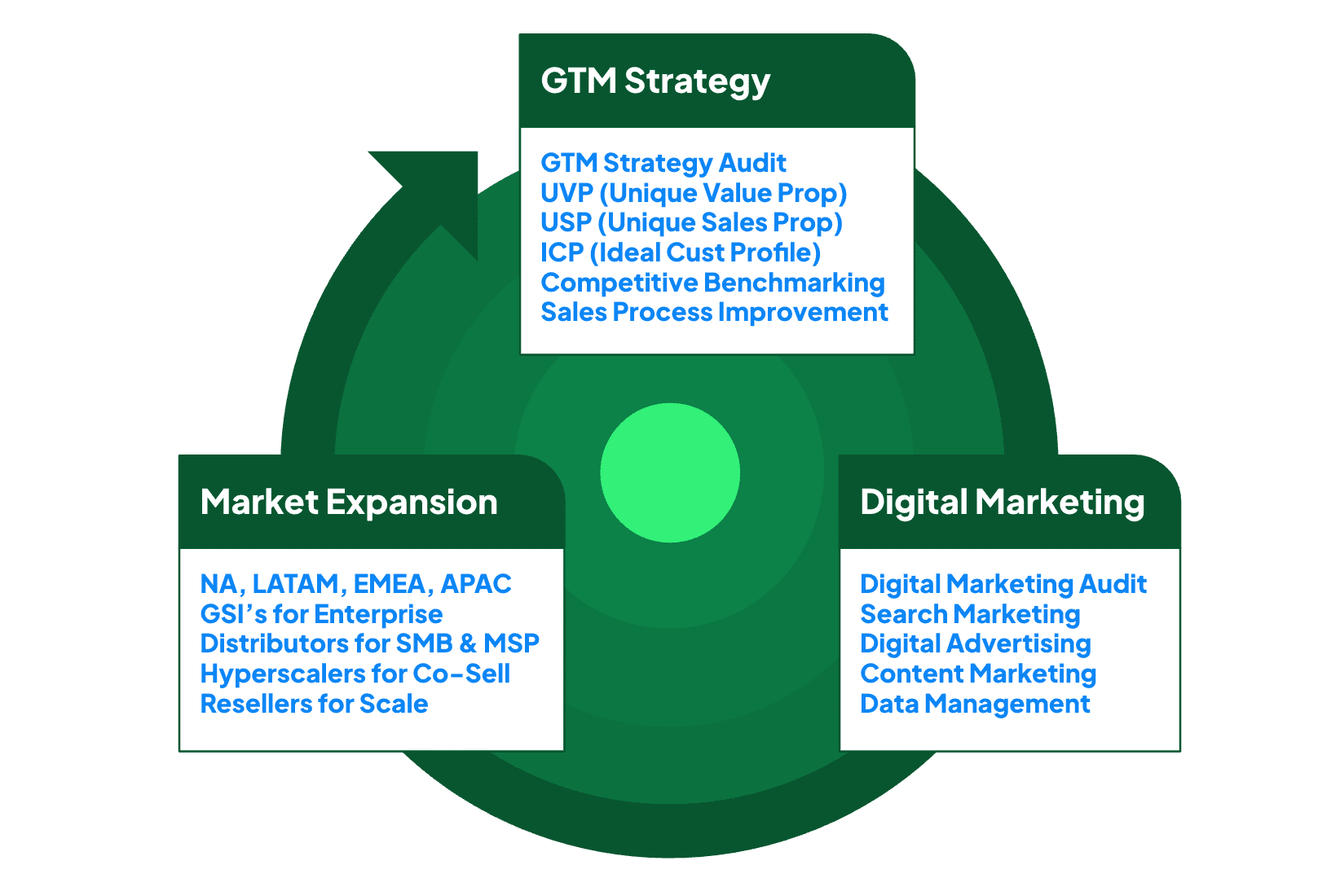Continuous evaluation & adjustment of GTM strategy is critical in today’s markets. Regular GTM and Digital Marketing Strategy Audits will ensure a market leading position is achieved and maintained.